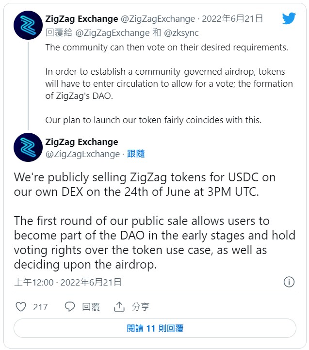以太坊第二層方案 zkSync 去中心化交易所 ZigZag 昨日 6 月 21 日於推特(Twitter)發文宣布,將於台灣時間 6 月 24 日晚間 11 點開啟平台同名代幣 ZigZag 的 IDO(首次代幣發行),IDO 將在 ZigZag 交易所上出售,目前僅提供以 USDC 支付。