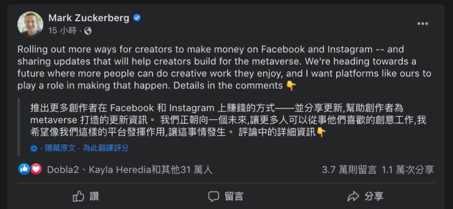社群龍頭 Meta 執行長組克伯 (Mark Zuckerberg) 於 6 月 21 日在臉書上宣布,公司正在為創作者構建更多在 Facebook 和 Instagram 上賺錢的方式,並將當前的一些盈利工具擴展到創作者層面。祖克柏表示,為了讓創作者帶來更多元的收入方式,Meta 將在 2024 年前為創作者提供付費制的線上活動、粉絲訂閱、頭號粉絲徽章 (Badges) 及電子報 (Bulletin)。