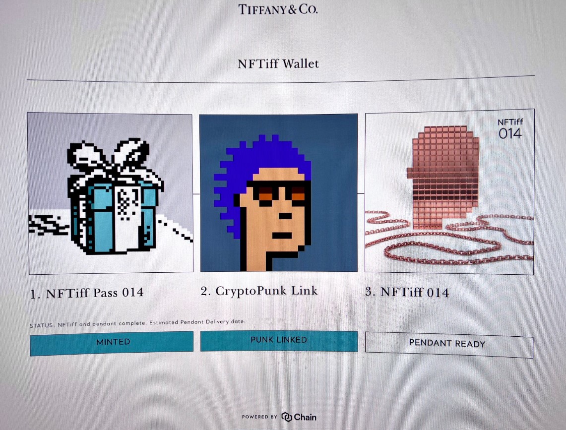 8 月 1 日,美國精品珠寶品牌 Tiffany 推出牌首個 NFT 項目 – NFTiff ,該 NFT 可兌換 CryptoPunks 寶石吊墜。昨日(4 日),NFTiff 預售結束,100 張名額全數售完。目前僅有 25 個被兌換成吊墜,其中包括知名歌手林俊傑。