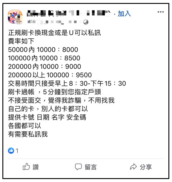 據《中華日報》報導,新北市警局指出該集團以一名 28 歲的江姓男子為首,涉嫌在網路上徵求信用卡換現的兼職工作,取得心存僥倖的民眾信用卡號後盜刷購買 USDT 套現,隨後教導受騙民眾向銀行提出異常交易申訴,企圖無本套利讓銀行蒙受 40 萬新台幣損失。