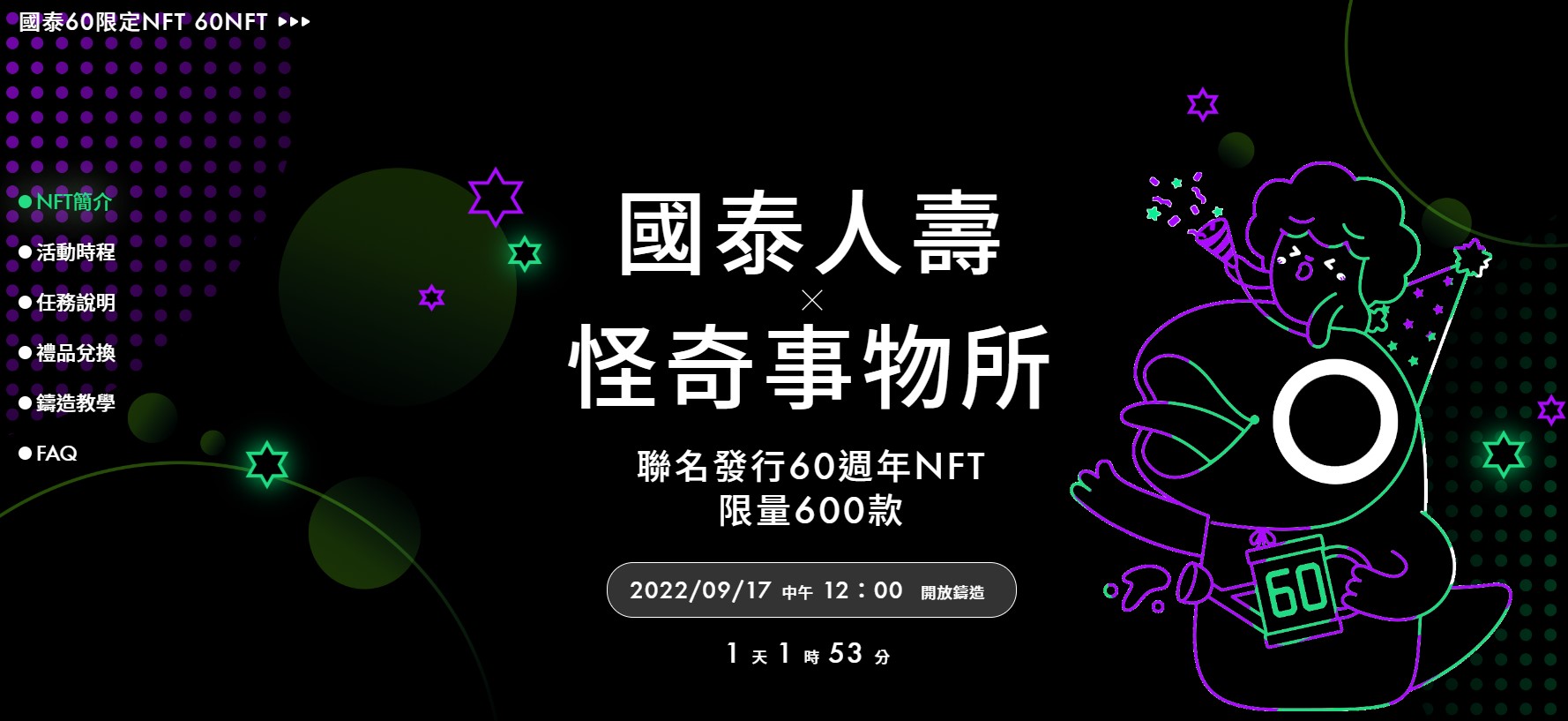一、活動目的: 歡慶本公司 60 週年,本公司與怪奇事物所聯名發行 60 週年 NFT ,特舉辦『國泰人壽 60 週年 NFT 』行銷活動(以下稱本活動)。