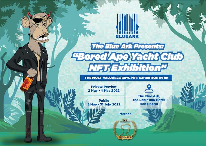 為了讓更多人目睹其丰采,BlueArk 正式宣佈與 Elite Apes 以及個別 NFT 收藏家合作,舉辦香港首個「無聊猿」NFT 展覽。展覽將於2022 年 5 月 5 日至 7 月 31 日在尖沙咀半島酒店的 The Blue Ark 內舉行,展覽中將展示全球最頂級的 NFT 項目。
